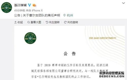 鉴于2019赛季冲超的工作目标及发展要求,经浙江绿城足球俱乐部有限公司董事会研究决定,与一线队主教练塞尔吉-巴尔胡安先生及教练团队终止工作协议。