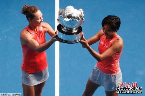 当地时间1月25日,2019年澳大利亚网球公开赛进入女双决赛较量,张帅/斯托瑟6-3/6-4挑落卫冕冠军巴博斯/梅拉德诺维奇,首次携手夺得大满贯冠军。张帅首夺大满贯冠军,成为第六位捧得大满贯桂冠的中国大陆金花、第四位拿下女双大满贯的中国大陆球员,也是13年来第一位夺得澳网女双冠军的中国球员。斯托瑟则时隔13年再夺大满贯女双冠军,首夺澳网女双桂冠。图为张帅与斯托瑟举起冠军奖杯。